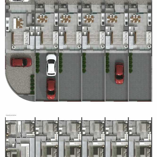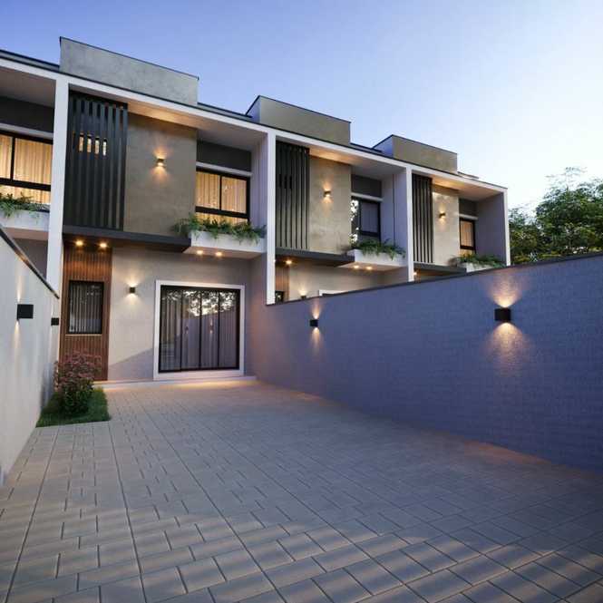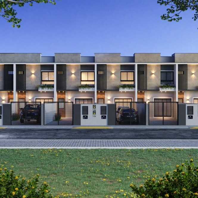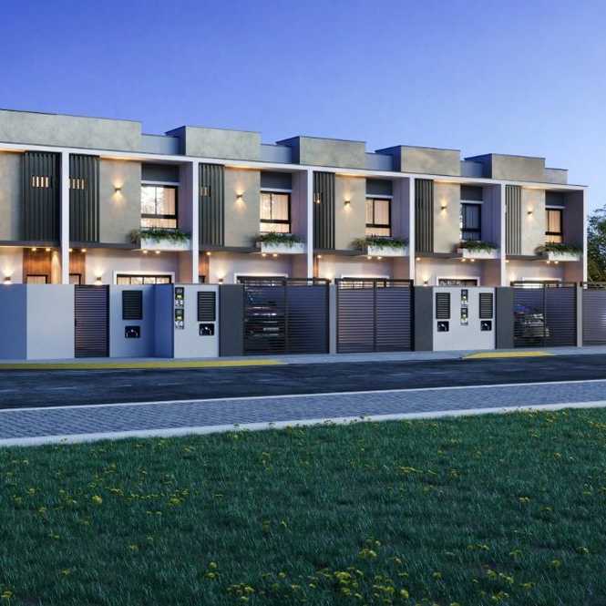 Geminado 02. Com duas suítes, na parte superior. Parte inferior, sala, cozinha, lavanderia, churrasqueira, garagem para dois carros.